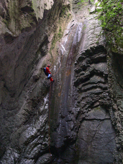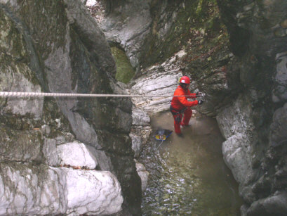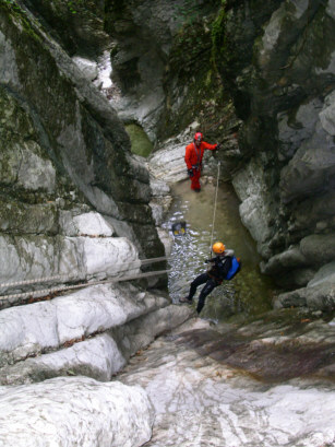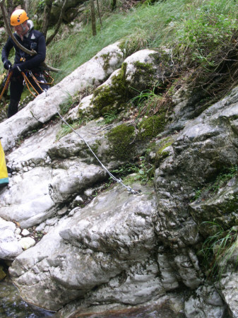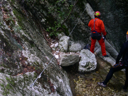 Piuttosto sono rimasto sconcertato per il lavoro di riattrezzatura trovato sul posto. Ci sarebbe anche da ridire sulle catene, ma soprattutto ? il quantitativo di ferro trovato che mi ha lasciato allibito. Posso ammettere che durante certi lavori possa scappare qualche golfaro di troppo, magari in previsione di portate considerevoli, ma certi cavi d?acciaio come mancorrente sono una vera aberrazione. Alcuni appaiono ridicoli persino nella loro funzione ed anche se si pensasse ad uno scorrimento importante. Non voglio fare polemiche e mi spiace ferire la buona volont? di qualcuno, ma non si possono trasformare i torrenti in delle ferrate e certamente non si valorizza una forra in questo modo. ? anzi!!